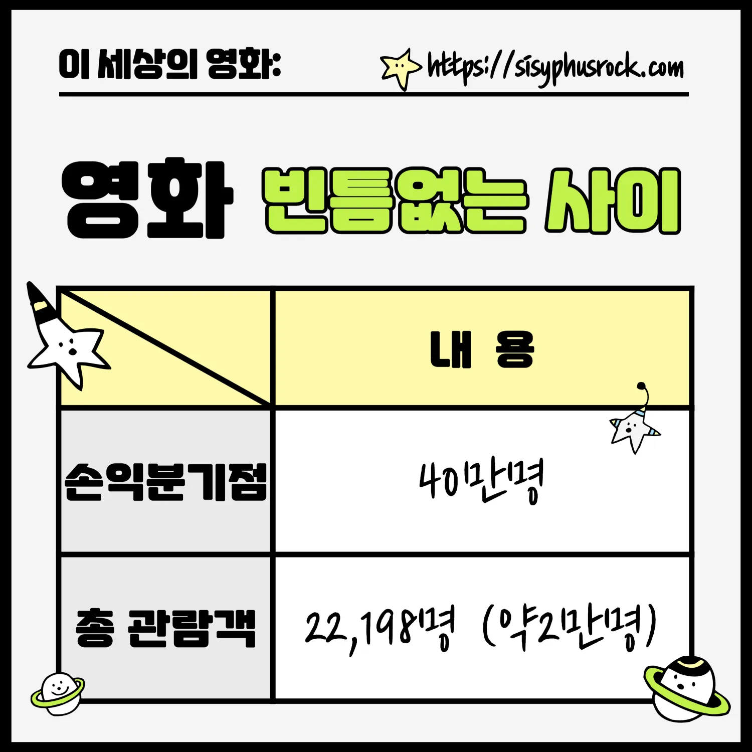 영화 빈틈없는 사이 손익분기점은 약 40만 명이라고 합니다.